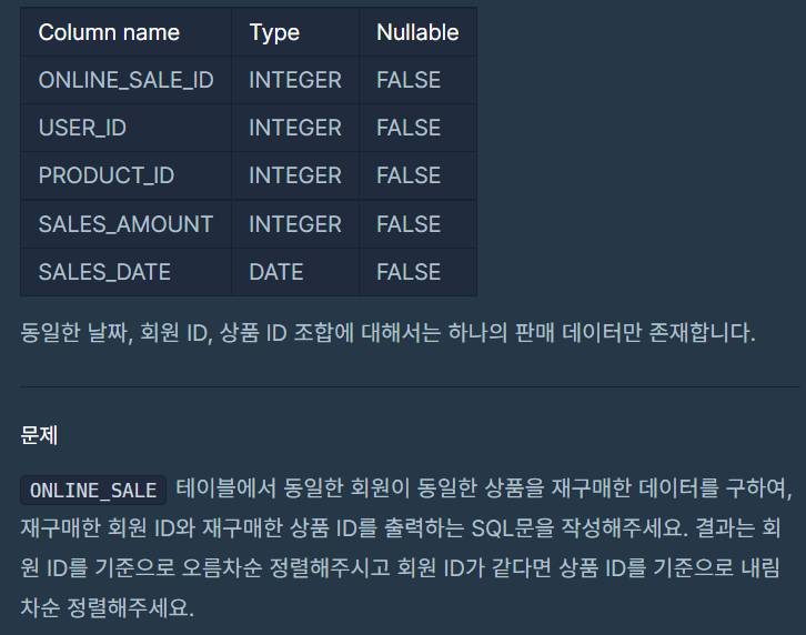 GROUP BY문과 GROUP BY문의 조건절을 나타내는 HAVING 절을 이용해 USER_ID, PRODUCT_ID로 묶고