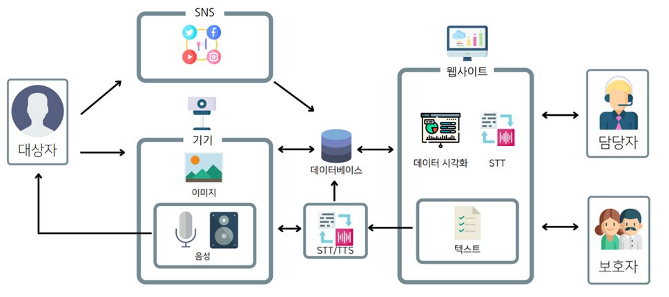 <그림1>은 전체 시스템 흐름도로, 자살 고위험군 대상자는 그들의 SNS와 애착인형에 부착된 IoT기기를 통해 관찰된다. 관찰된 데이터는 DB에 저장되며 저장된 데이터를 시각화 하여 웹사이트로 나타낸다. 이때, 담당자는 여러명의 관찰대상자의 데이터를 확인할 수 있지만 보호자는 관련된 대상자 한 사람의 데이터만 확인할 수 있다.