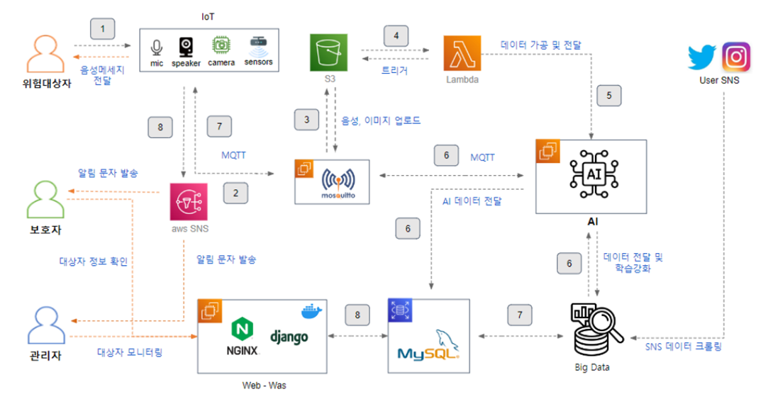 <그림2>는 시스템 구성도로, 인형에 부착된 IoT기기로 자살위험대상자의 이미지 및 음성 데이터를 수집한다. 해당 데이터를 MQTT통신을 통해 S3로 음성 및 이미지 데이터를 업로드한다. S3에 이미지 업로드 된 것을 트리거로 람다코드가 실행된다. 코드를 통해 데이터가 AI로 전달되고 AI모델링 데이터가 DB로 저장되며 DB 데이터를 웹으로 시각화 하여 보여준다.