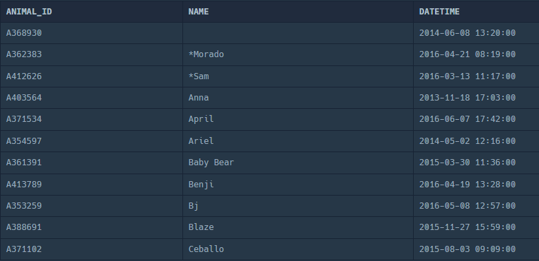name 열에 대해서 먼저 정렬한 후 name이 같을 경우, datetime으로 정렬한다.
