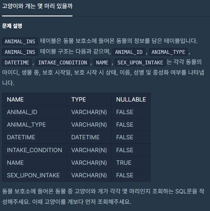 group by 를 통해 ANIMAL_TYPE 별로 그룹화 하고 order by를 통해 cat 이 dog보다 앞에 조회할 수 있도록 했다.
