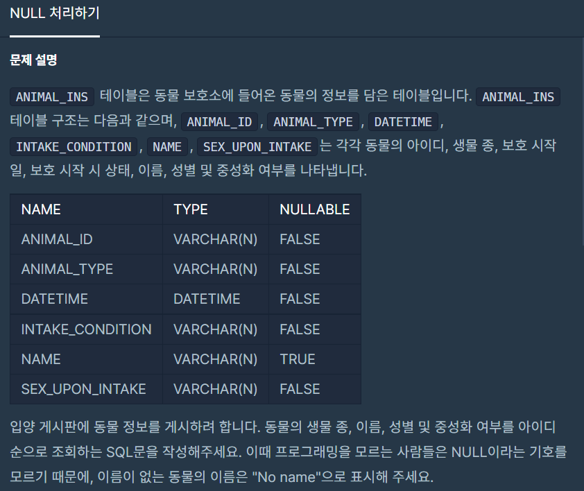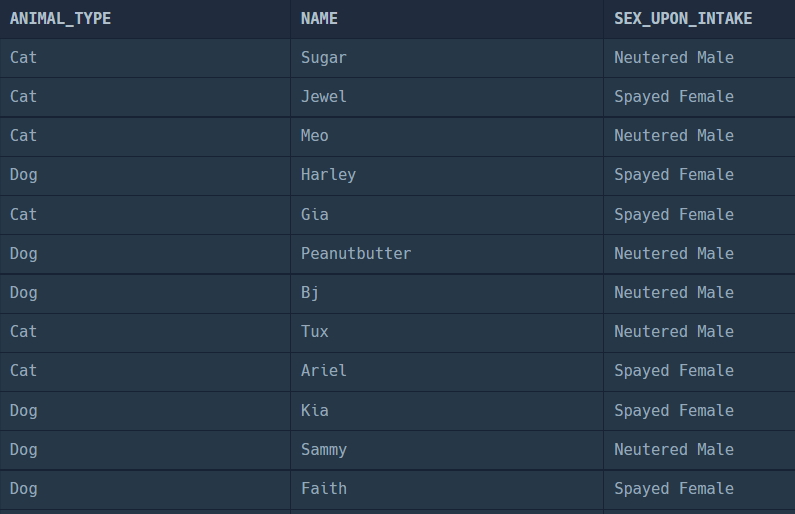 SELECT ANIMAL_TYPE, IFNULL(NAME,"No name") NAME, SEX_UPON_INTAKE