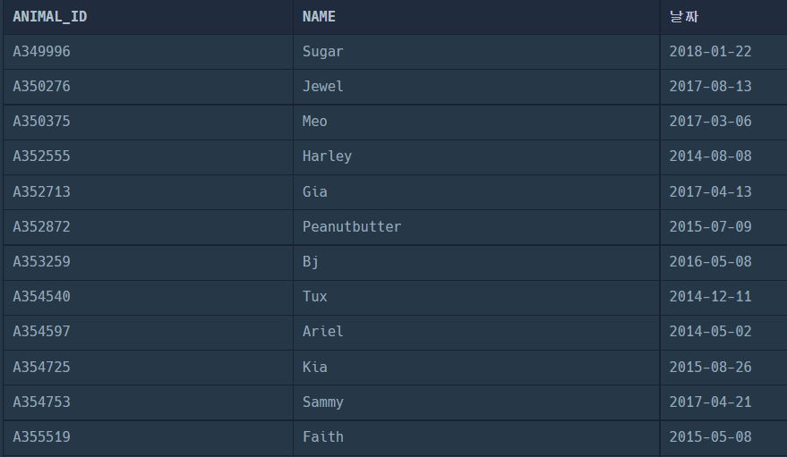 SELECT ANIMAL_ID, NAME, DATE_FORMAT(DATETIME, '%Y-%m-%d') as '날짜'