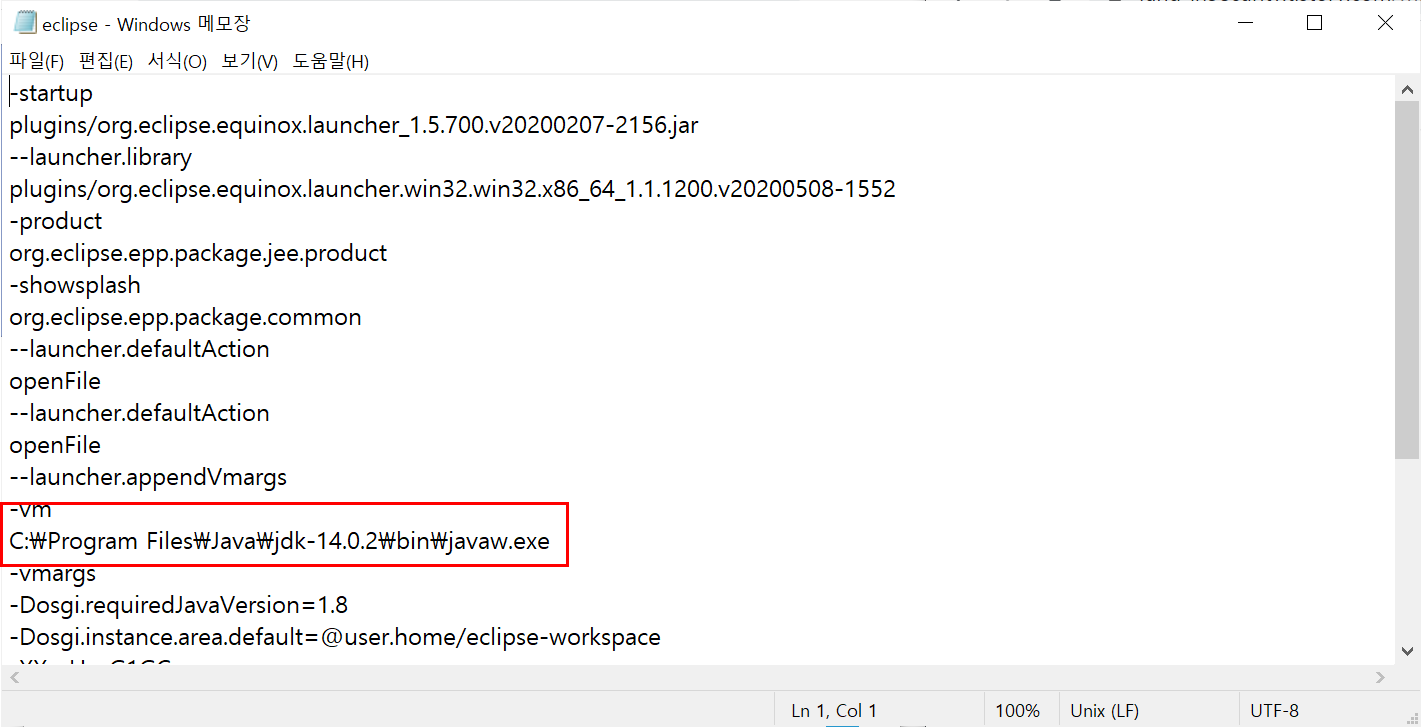 eclipse.ini 파일에 들어가 아래와 같이 javaw.exe 파일이 있는 절대 경로를 추가해준다.