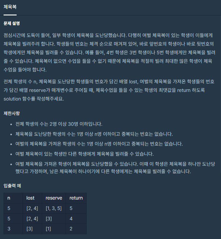 문제 url: https://school.programmers.co.kr/learn/courses/30/lessons/42862 프로그래머스 코드 중심의 개발자 채용. 스택 기반의 포지션 매칭. 프로그래머스의 개발자 맞춤형 프로필을 등록하고, 나와 기술 궁합이 잘 맞는 기업들을 매칭 받으세요. programmers.co.kr def solution(n, lost, reserve): # 오름차순으로 정렬 lost.sort() reserve.sort() # 차집합을 이용해 여벌옷이 있는데 도난당했을 경우 제외 new_lost = set(lost) - set(reserve) new_reserve = set(reserve) - set(lost) for r in new_reserve: if r - 1 in new..