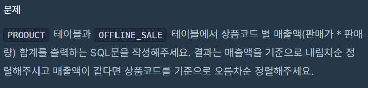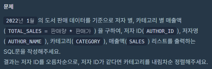 https://school.programmers.co.kr/learn/courses/30/lessons/131534 프로그래머스 코드 중심의 개발자 채용. 스택 기반의 포지션 매칭. 프로그래머스의 개발자 맞춤형 프로필을 등록하고, 나와 기술 궁합이 잘 맞는 기업들을 매칭 받으세요. programmers.co.kr SELECT YEAR(b.SALES_DATE) as YEAR, MONTH(b.SALES_DATE) as MONTH, count(DISTINCT(b.USER_ID)) as PUCHASED_USERS, ROUND(count(DISTINCT(b.USER_ID)) / (SELECT COUNT(*) FROM USER_INFO WHERE YEAR(JOINED) = '2021'), 1) as PUCHASED..