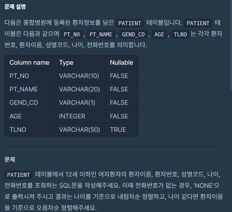 https://school.programmers.co.kr/learn/courses/30/lessons/132203 프로그래머스 코드 중심의 개발자 채용. 스택 기반의 포지션 매칭. 프로그래머스의 개발자 맞춤형 프로필을 등록하고, 나와 기술 궁합이 잘 맞는 기업들을 매칭 받으세요. programmers.co.kr SELECT DR_NAME, DR_ID, MCDP_CD, date_format(HIRE_YMD, '%Y-%m-%d') as HIRE_YMD FROM DOCTOR WHERE MCDP_CD IN ('CS', 'GS') ORDER BY HIRE_YMD desc, DR_NAME; 우선, IN 함수를 사용하여 MCDP_CD가 CS나 GS인 경우의 조건을 만족시켰다. 그리고 HIRE_YMD 포맷을 설정해주..