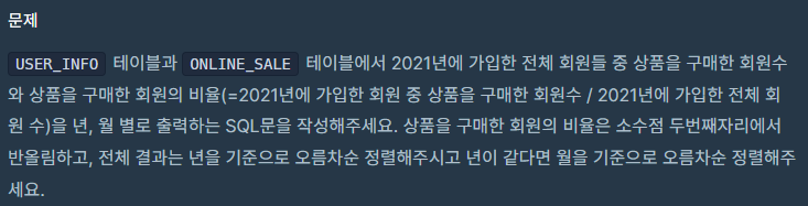 https://school.programmers.co.kr/learn/courses/30/lessons/131534 프로그래머스 코드 중심의 개발자 채용. 스택 기반의 포지션 매칭. 프로그래머스의 개발자 맞춤형 프로필을 등록하고, 나와 기술 궁합이 잘 맞는 기업들을 매칭 받으세요. programmers.co.kr SELECT YEAR(b.SALES_DATE) as YEAR, MONTH(b.SALES_DATE) as MONTH, count(DISTINCT(b.USER_ID)) as PUCHASED_USERS, ROUND(count(DISTINCT(b.USER_ID)) / (SELECT COUNT(*) FROM USER_INFO WHERE YEAR(JOINED) = '2021'), 1) as PUCHASED..
