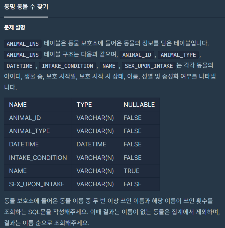 SELECT A.NAME as NAME, A.DATETIME as DATETIME FROM ANIMAL_INS A LEFT OUTER JOIN ANIMAL_OUTS B ON A.ANIMAL_ID = B.ANIMAL_ID WHERE B.ANIMAL_ID IS NULL ORDER BY A.DATETIME limit 3; ANIMAL_ID를 기준으로 ANIMAL_INS를 왼쪽에 두고 LEFT OUTER JOIN을 실행한다. ANIMAL_INS에만 값이 존재하면 입양을 가지 못한 동물임을 뜻한다. 이때, ANIMAL_OUTS의 ANIMAL_ID는 NULL을 갖게 되므로 조건을 둔 후에 limit 명령어를 통해 3개만 조회되도록 한다. [실행결과]
